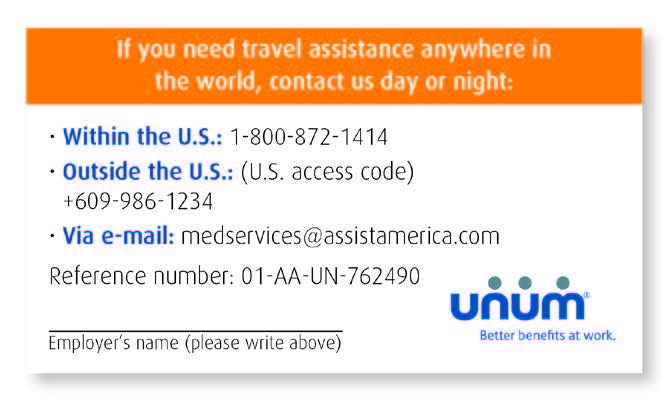Unum also provides a Travel Assistance benefit, which gives you access to resources while traveling. Whenever you travel 100 miles or more from home — to another country or just another city — be sure to pack your worldwide emergency travel assistance phone number. Travel assistance speaks your language, helping you locate hospitals, embassies, and other “unexpected” travel destinations. Just one phone call connects you and your family to medical and other important services 24 hours a day.