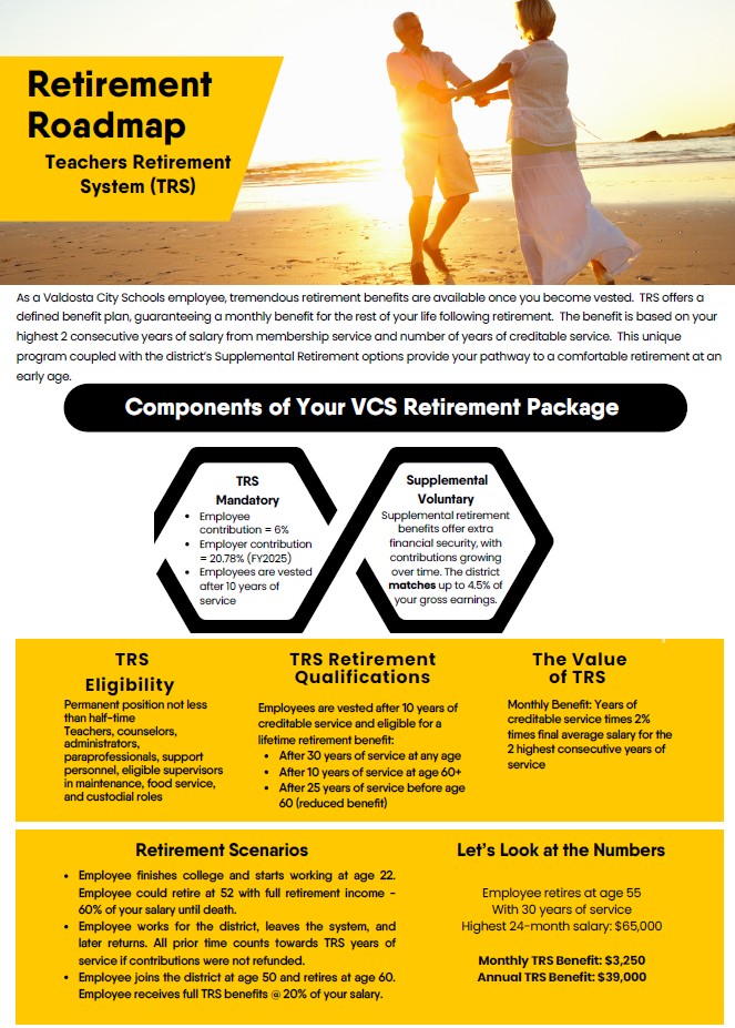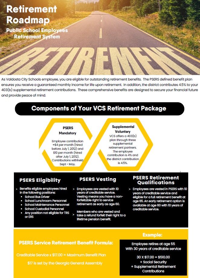 The Teachers Retirement System (TRS) and Public School Employees Retirement System (PSERS), available to employees, are established by the Georgia Legislature, with the governing boards determining plan design and employee contribution rates. Valdosta City Schools facilitates payroll deductions for your contributions and provides administrative support. Additionally, we offer a Supplemental 403(b) Retirement Plan to help you plan for the retirement you deserve.