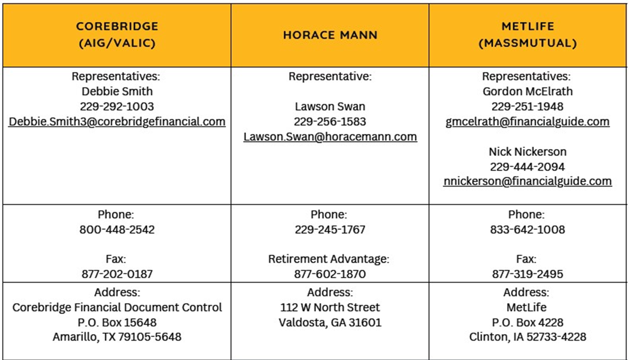 Valdosta City Schools has partnered with three supplemental retirement vendors for your 403(b) plan. Please contact one of the following vendors to participate.